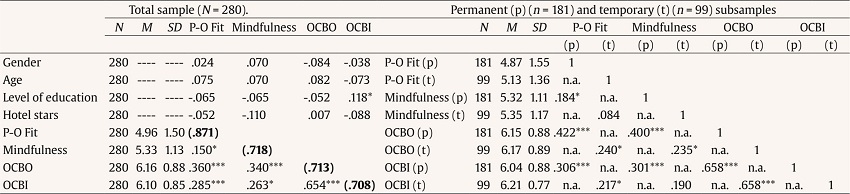 Table 1 shows the descriptive analysis results as well as the inter-correlations between the study variables for the overall sample (N = 280) and for the permanent (n =181) and temporary (n = 99) sub-samples. This table shows that permanent and temporary employees reported similar mean values for P-O Fit, M(p) = 4.87 vs. M(t) = 5.13, OCBO, M(p) = 6.15 vs. M(t) = 6.17, and OCBI, M(p) = 6.04 vs. M(t) = 6.21). However, the inter-correlations between P-O Fit, trait mindfulness, and OCBs were markedly different depending on the employment status considered (temporary versus permanent), thus suggesting that the distinction between temporary and permanent employment status does affect “how” these variables perform together in the research model predicted in this study.