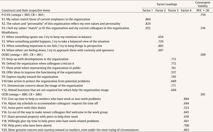 All the items were checked for skewness and kurtosis. Skewness values for all the items ranged between -2 and +2 (P-O Fit [-0.901, -0.705]; mindfulness [-0.738, -0.958]; OCBO [-1.857, -1.269]; OCBI [-1.942, -1.106]). Kurtosis values also ranged between -7 and +7 (P-O Fit [-0.290, 0.619]; mindfulness [.322, .967]; OCBO [1.345, 4.552]; OCBI [0.549, 4.462]). In line with previous recommendations, these values are acceptable to prove that the data does not greatly depart from normality (see Byrne, 2010; Hair et al., 2010). Importantly, our adapted scale of mindfulness fulfilled various of Hinkin’s (1998) recommendations for the adequate development of measures for use in research: factor loadings were above .40, the proportion of variance explained in the variable by each item was greater than 60%, and the inter-item associations were greater than .40.