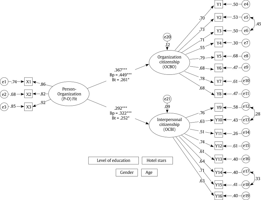In our statistical analysis, the control variables were gender (male = 1, female = 2), age (1 = up to 25 years, 2 = 25 to 40 years, 3 = 40 to 55 years, 4 = 55 to 70 years, 5 = 70 years and older), level of education (1 = elementary school, 2 = secondary education, 3 = high school, 4 = vocational training, 5 = intermediate university studies, and 6 = university senior) and the hotel’s number of stars. These variables were included because prior research suggests gender and age differences exist in the extent to which compassionate behaviors are performed (López et al., 2018) and that level of education and hotel’s number of stars correlate with P-O Fit and OCBs (Afsar & Badir, 2015). Thus, any of these controls had the potential to co-vary with the dependent variables of this study, namely OCBO and OCBI.