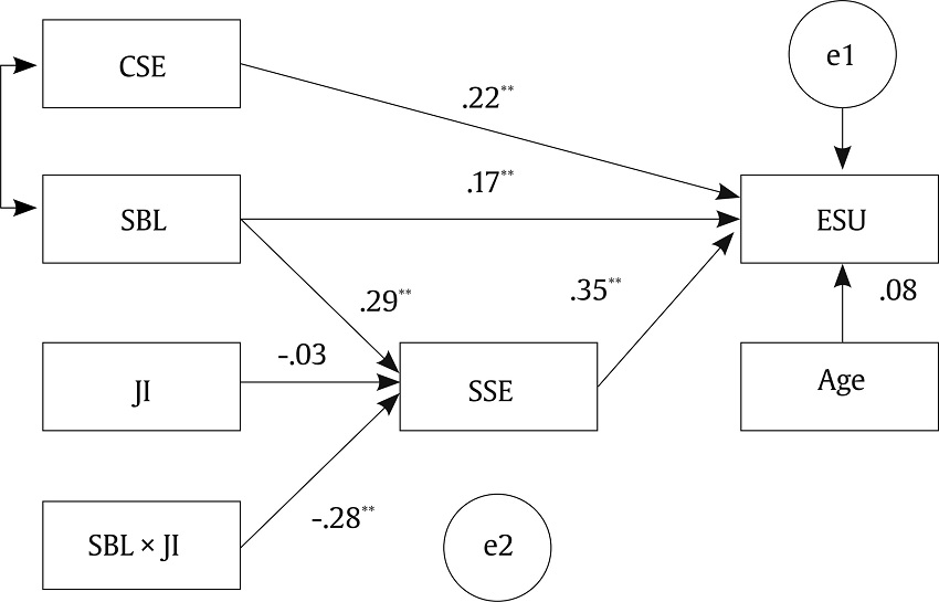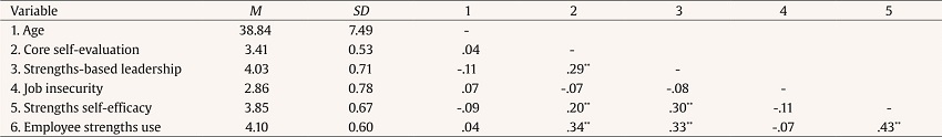 Means, standard deviations, and correlations of research variables are displayed in Table 3. Results of correlational analysis showed that strengths-based leadership is positively related to strengths self-efficacy (r = .30, p < .01) and employee strengths use (r = .33, p < .01), and strengths self-efficacy is positively related to employee strengths use (r = .43, p < .01). These results provide preliminary evidence for our research hypotheses.
