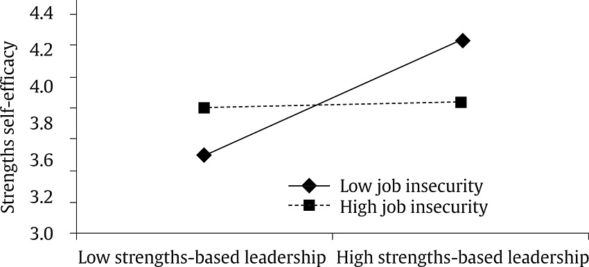 Hypothesis 2: Job insecurity can lessen the relationship between strengths-based leadership and strengths self-efficacy in such a way that the positive relationship will be stronger for employees low in job insecurity rather than employees high in job insecurity.