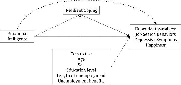 The purpose of the present study was twofold: (a) to examine the relationship among EI, resilient coping, job search behaviors, happiness, and depressive symptoms and (b) to analyze the potential role of resilient coping as a mediator in the relationship among EI, depressive symptoms, job search behaviors, and happiness after controlling for the confounding effect of age, sex, education level, length of unemployment, and unemployment benefits. Overall, considering prior research on the significant association among EI, resilience, and dependent variables, we stated the following hypotheses: