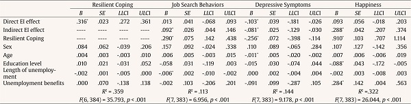 For job search behaviors, a regression analysis showed that the total effect of EI on this outcome was significant (B = .104, SE = .034, p < .05, 95% CI [.038, .171]), but the inclusion of resilient coping dissipated the direct effect (B = .013, SE = .041, p > .05, 95% CI [-.068, .093]). These results provide evidence that resilient coping might be a full mediator between EI and job search behaviors, as indicated by the indirect effect (B = .092, SE = .026, p < .05, 95% CI [.044, .146]). Only one covariable, length of unemployment, was significantly and negatively associated to job search behaviors, though this effect was almost null (B = -.006, p < .05). Together, the simple mediator model was significant, accounting for 11.3% of the variance in job search behaviors, F(7, 383) = 6.956 p < .001.