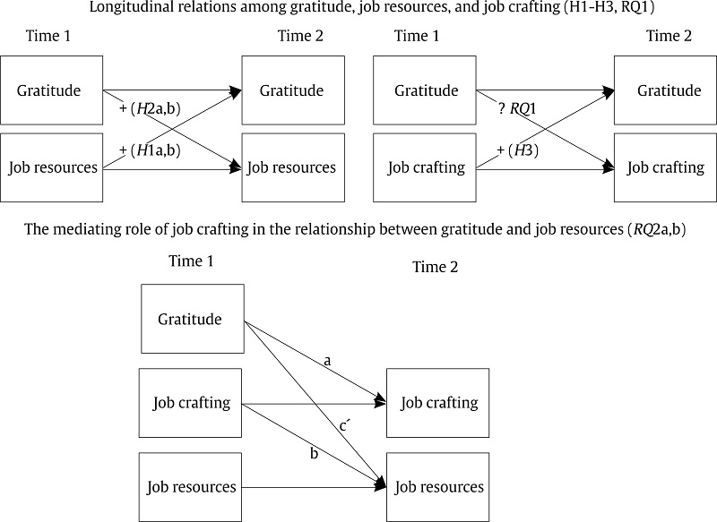 The aim of the present study was to examine the relationships between employees’ gratitude, job resources, and job crafting over time. More specifically, we tested whether there might be a positive and reciprocal relationship between gratitude and job resources, as well as between gratitude and job crafting behaviours. Furthermore, we explored whether job crafting might be an explanatory mechanism in the relationship between gratitude and job resources.