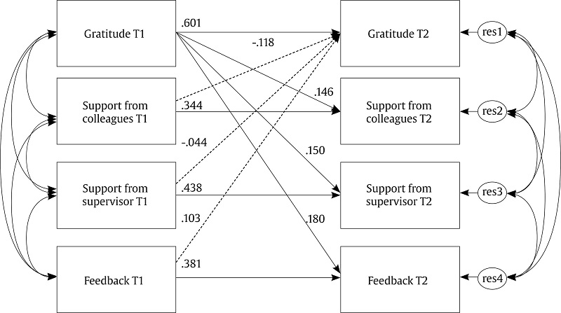 First, we examined longitudinal relationships between employees’ gratitude and social job resources. The model (see Figure 2) demonstrated excellent fit, χ 2(6) = 0.94, p = .98, CFI = 1, SRMR = .01, RMSEA = .00, p = .99, 90% CI [.00, .00]. All variables measured at T1 significantly predicted their T2 counterparts. We found no support for hypothesis H1a, as the support employees received from their supervisors and the feedback they reported at time 1 did not predict employees’ gratitude at time 2. Moreover, the support from the colleagues at T1 had a marginally significant and negative effect on employees’ gratitude at T2 ( B = - 0.31, z = -1.77, p = .08, β = - .12). However, in line with hypothesis H2a, the results indicated that gratitude at time 1 predicted support from the supervisor ( B = 0.06, z = 2.08, p = .04, β = .15), support from the colleagues ( B = 0.06, z = 2.19, p = .03, β = .15), and feedback at time 2 ( B = 0.08, z = 2.70, p = .01, β = .18).