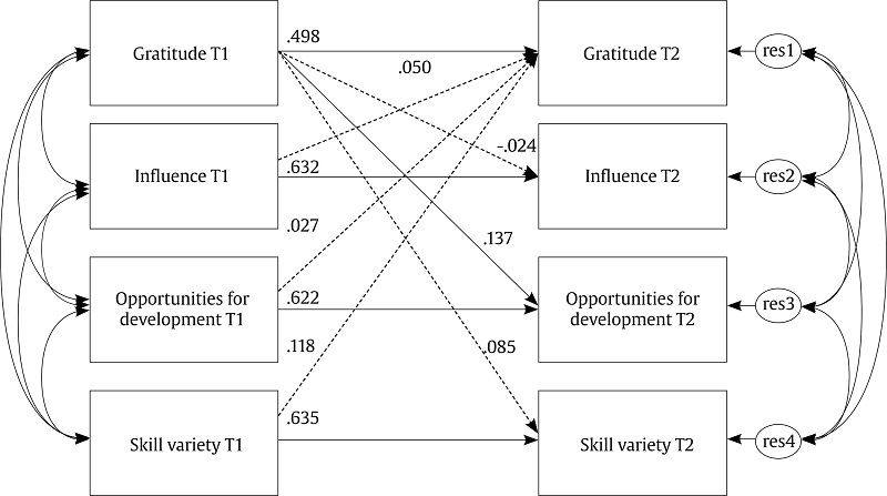 The relationships between employees’ gratitude and structural job resources were tested in a separate analysis. The model (see Figure 3) fitted the data well, χ 2(6) = 1.72, p = .94, CFI = 1, SRMR = .01, RMSEA = .00, p = .99, 90% CI [.00, .01]. The autoregressive paths were significant. The results indicated that none of the structural resources measured at T1 predicted employees’ gratitude at T2, lending no support to hypothesis H1b. Nonetheless, the data provided partial support to hypothesis H2b, seeing that gratitude at T1 positively predicted opportunities for development at T2 ( B = 0.05, z = 2.34, p = .02, β = .14). The relationship between gratitude at T1 and skill variety at T2 was marginally significant ( B = 0.04, z = 1.66, p = .09, β = .08), whereas gratitude at T1 did not predict influence at T2.