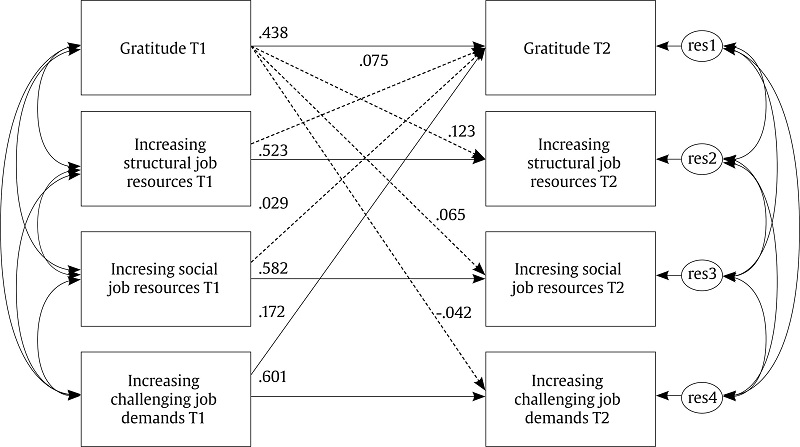 Correlations among the main variables are displayed in Table 2. With very few exceptions, the associations were positive and statistically significant. Gratitude (at T1 and T2) was positively related to all job resources (measured at T1 and T2), as well as to the three dimensions of job crafting (at T1 and T2). Job resources (at T1 and T2) were positively correlated with job crafting (at T1 and T2).