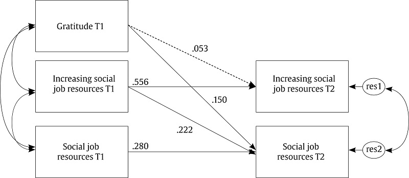Our results suggest that there are no reciprocal relationships between gratitude and social job resources. Job resources at T1 did not predict employees’ gratitude at T2 ( H1a), although employees’ gratitude at T1 predicted more social job resources three months later ( H2a). The finding that gratitude led to more social resources is consistent with previous theoretical (e.g., Algoe, 2012; McCullough et al., 2001) and empirical (e.g., Chen et al., 2021; Feng & Yin, 2021; Nicuta et al., 2022; Wood, Maltby, Stewart, et al., 2008) work suggesting that gratitude facilitates the process of building and maintaining social relationships in different contexts, including the workplace. However, the question remains as to why social job resources at T1 were not a significant predictor of employees’ gratitude at T2. A couple of explanations can be put forward. First, our results suggest that social job resources are not very stable across time. Therefore, it could be argued that the time interval between the two study waves was too long for social job resources at T1 to exert an effect on employees’ gratitude three months later. Second, it might be that the effect of received social support on employees’ gratitude is contingent upon their individual need for help and assistance. A study conducted by Lee et al. (2019) showed that employees are more likely to express gratitude when they specifically asked others for their help. When assistance was proactively provided, employees were less likely to express appreciation to their helpers. These previous findings might also explain why the effect of social support from colleagues on employees’ gratitude was negative (although only marginally significant). It is possible that employees could sometimes perceive the help they receive as reflecting other people’s lack of trust in their abilities to independently solve work-related tasks. Therefore, social support might, under certain conditions, jeopardize employees’ need for autonomy, resulting in decreased gratitude.
