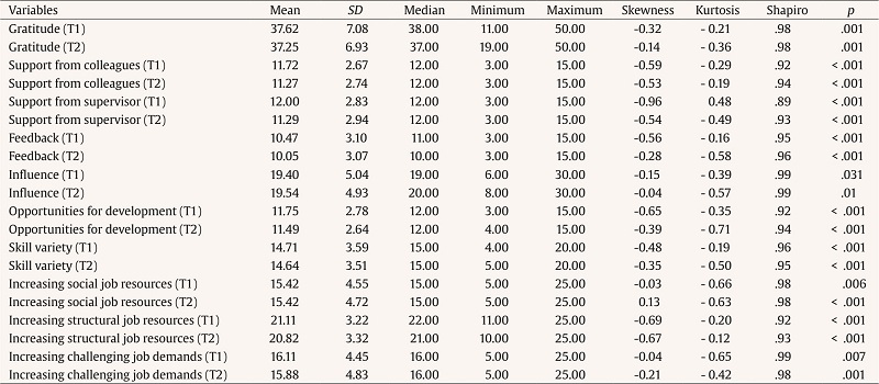 Descriptive statistics for the main study variables are presented in Table 1. None of the variables met the assumption of univariate normality. Outliers were identified for some of the variables; however, no extreme values were found. Our results further suggested that the multivariate normality assumption was not met. We first tested the multivariate normality assumption for the eight variables which were to be used in the path analysis concerning the relationship between gratitude and social job resources. Mahalanobis distances were situated between 0.89 and 6.04, with the multivariate distribution being both skewed (Mardia = 6.23, skewness = 285.37, p < .001) and leptokurtic (Mardia = 95.73, kurtosis = 10.31, p < .001). The second analysis included gratitude and each of the three structural job resources (T1 and T2). The Mahalanobis distances were situated between 0.80 and 5.27 and the multivariate distribution was skewed (Mardia = 4.76, skewness = 218.03, p < .001) and leptokurtic (Mardia = 90.29, kurtosis = 6.75, p < .001). Finally, the third analysis included gratitude and the dimensions of job crafting, measured at T1 and T2. Mahalanobis distances were situated between 1.06 and 5.49 and the multivariate distribution was again both skewed (Mardia = 4.57, skewness = 209.24, p < .001) and leptokurtic (Mardia = 92.06, kurtosis = 7.91, p < .001). Given the results of the preliminary analyses, Spearman’s rank correlation coefficient was used to compute the associations between the variables. We also decided to use the diagonally weighted least squares estimator for the path analyses.