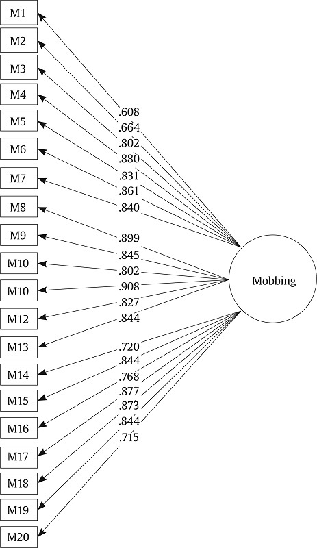 All factor loadings were statistically significant (p < .001), ranging between .608 (Item 1) and .908 (Item 11) (Figure 1). Table 1 shows the descriptive data of the Mobbing-UNIPSICO scale items and the item-total corrected polyserial correlations. All of them were statistically significant, ranging between .309 (item 20) and .684 (item 11), and with standard errors ranging between .004 (item 4) and .016 (item 20). The composite reliability index (CR = .975), Cronbach’s alpha (α = .93) and the average variance extracted (AVE = .709) showed very good values. The results confirmed the hypothesized model.