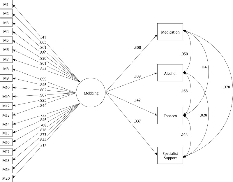 The predictive validity of the Mobbing-UNIPSICO Scale has been verified with the validity model because the total score on the mobbing questionnaire predicts the increase in both alcohol and tobacco consumption, a greater use of medication, and the need to seek support from a specialist to overcome some personal crisis related to work. On the whole, these results support the predictive validity of the Mobbing-UNIPSICO Scale, given that specialist support (Messiaen et al., 2021; Rudkjoebing et al., 2021), alcohol intake (Aykut et al., 2016; Campo & Klijn, 2018; Giorgi, 2010; Giousmpasoglou et al., 2018; Ula et al., 2018), tobacco use (Hansen et al., 2021; Jacobsen et al., 2018; Lloyd, 2020), and medication use (Lallukka et al., 2012; Messiaen et al., 2021; Rudkjoebing et al., 2021) have been identified as relevant consequences of mobbing activities. Moreover, the model shows that the consumption of alcohol and tobacco are positively correlated, whereas the search for specialist support is more related to the increase in the use of medication.