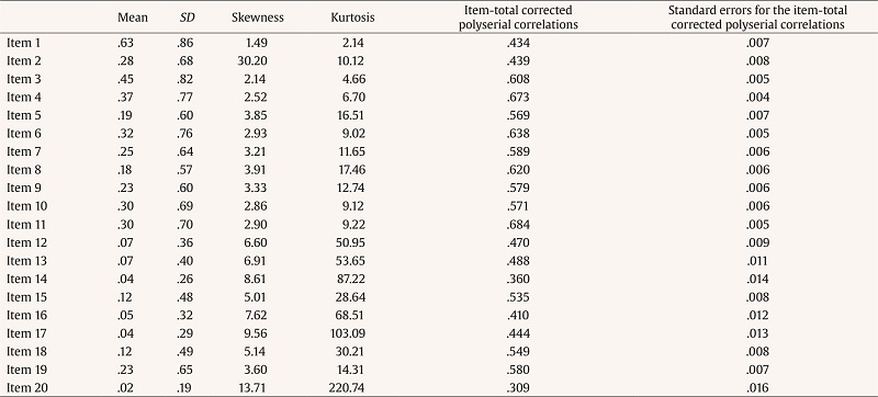 Table 1 shows descriptive statistics for the items and corrected item-scale correlations. All the items presented very good homogeneity indices, except for item 20, whose value is much lower than that of the other items (.309). This item had the highest kurtosis (Ku = 220.74) and the second most extreme skewness value (Sk = 13.71). In addition, Item 17 (Ku = 103.09, Sk = 9.56) and Item 14 (Ku = 87.22, Sk = 8.61) showed high values for kurtosis and skewness.