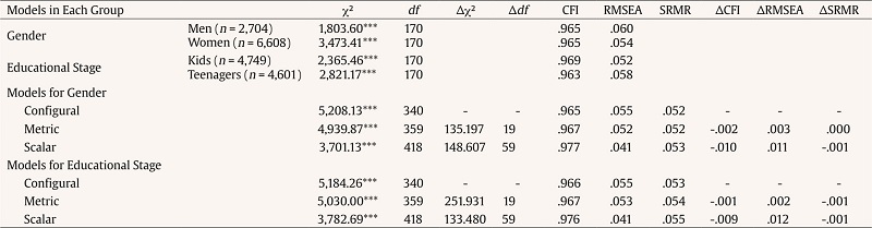 Likewise, the measurement invariance across gender and educational stage was evaluated by calculating three nested invariance models: configural, metric, and scalar. To study invariance by educational stage, two groups were formed: teachers working with children up to 12 years of age (infant and primary), representing 50.8% of the sample, and teachers working with adolescents (secondary and trade school), representing 49.2% of the total sample. To assess the degree of invariance among the models, we followed the indications of Meade et al. (2008), who recommend the use of an approximative fit index such as CFI or RMSEA because the c2 is greatly affected by sample sizes as large as the one in this study (Shi et al., 2018). Thus, evidence of measurement invariance was supported by the following changes in the between-model fit indices: reject if CFI change is lower than -.010, RMSEA change is greater than .010, and SRMR change is greater than .015 (Chen, 2007; Cheung & Rensvold, 2002).