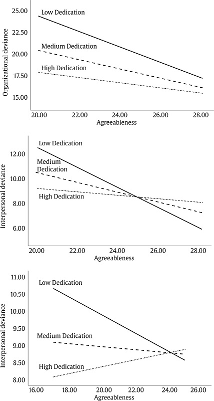 The last analyses performed were moderation analyses. According to Table 4, only five potential moderator effects exists, all with CWB: Agreeableness x Dedication in organizational deviance, and four in the prediction of Interpersonal deviance, namely Negative emotionality x Absorption, Extraversion x Dedication, Agreeableness x Dedication, and Conscientiousness x Absorption. These relationships were explored using bootstrapping (5,000 samples) with the PROCESS Macro. Results showed that only associations involving Dedication are significant. Thus, low (B = -0.927, p < .001), medium (B = -0.558, p < .001) and high (B = -0.323, p = .038) levels of Dedication moderate the relationship between Agreeableness and Organizational deviance. Low (B = -0.815, p < .001) and medium (B = -0.410, p < .001) levels of Dedication moderates the relationship between Agreeablenes and Interpersonal deviance, whilst the effect of Extraversion over Interpersonal deviance s substantially lower when Dedication is low (B = -0.262, p < .011). All these moderations are shown in Figure 1.