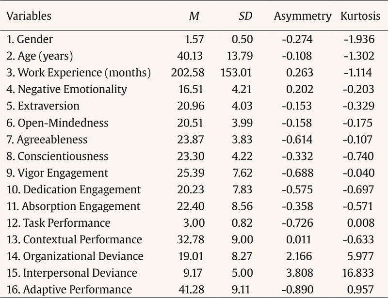 The analyses were performed using SPSS v.27 and Jamovi. We estimated descriptive statistics (M, SD, asymmetry, and kurtosis), reliability (Ω), correlations (Spearman’s rho test), hierarchical regression analyses and moderation analyis. Regarding hierarchical regression, we developed a different model with each performance dimension as the criterion (i.e., task performance, contextual performance, CWB-interpersonal, CWB-organizational, and adaptive performance). We introduced control variables in Step 1 (gender and work experience), the Big Five in Step 2, and work engagement dimensions in Step 3. Moderation analyses were performed with PROCESS macro for SPSS (Hayes, 2022).