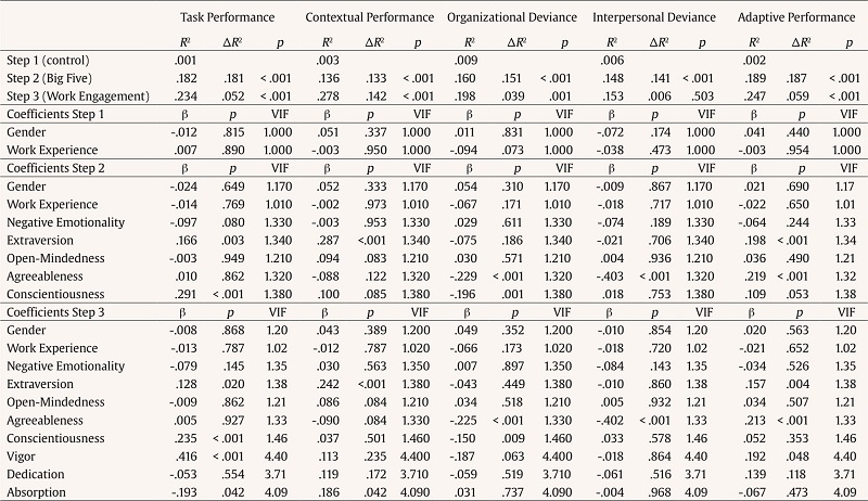 Hierarchical regression analyses are displayed in Table 3. In the control variables, age was excluded because of the aforementioned overlap with work experience. Big Five personality traits are involved in all predictive models, whilst work engagement only in positive dimensions of job performance (i.e., task performance, contextual performance, and adaptive performance). Now we shall discuss the results model by model.
