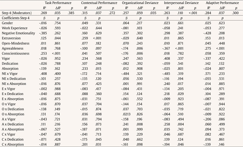 The second model used contextual performance as the criterion (27.8% of explained variance, 14.2% due to work engagement). The predictive variables were Extraversion (β = .242, p < .001) and Absorption (β = .186, p = .042)