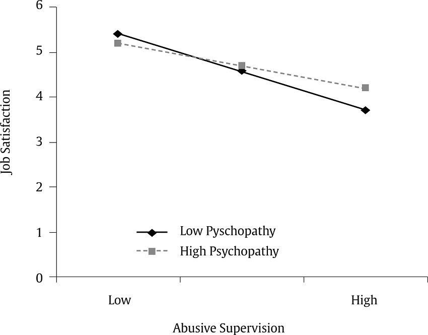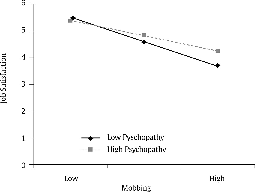 Under high mobbing and abusive supervision conditions, employees who had high levels of psychopathy reported slightly more job satisfaction than employees who scored low on psychopathy. On the other hand, in low mobbing and abusive supervision conditions, employees who had low psychopathy levels reported higher levels of job satisfaction than those who scored high on psychopathy. Employees with high scores of psychopathy may not be affected by mobbing and abusive supervisory behaviors as much as employees with low scores of psychopathy. Psychopathy tendency includes being emotionless, cold, and distant. These traits are likely to affect their perceptions of exposure to different forms of workplace mistreatment as well as their related reactions to these behaviors.