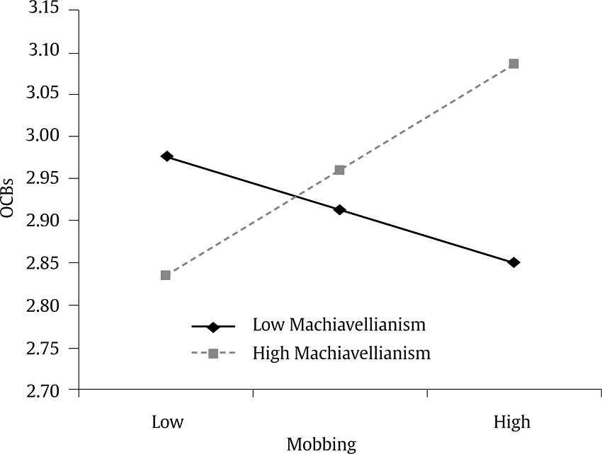 The moderating effect of Machiavellianism in the relationship between mobbing and OCBs was significant (B = 0.22, SE = .06, p < .001, 95% CI [0.09, 0.34]. The unstandardized simple slope for the employees -1 SD below the mean of Machiavellianism was B = -0.09, SE = .05, p = .11, 95% CI [-0.19, 0.02]. The unstandardized simple slope for the employees +1 SD above the mean of Machiavellianism was B = 0.17, SE = .05, p = .002, 95% CI [0.06, 0.27]. Interestingly, when mobbing was high, employees who had high Machiavellianism scores performed higher levels of OCBs than those who had low levels of Machiavellianism. In the low mobbing condition, employees with high Machiavellianism scores reported significantly lower scores on OCBs than those with low Machiavellianism scores (Figure 3).
