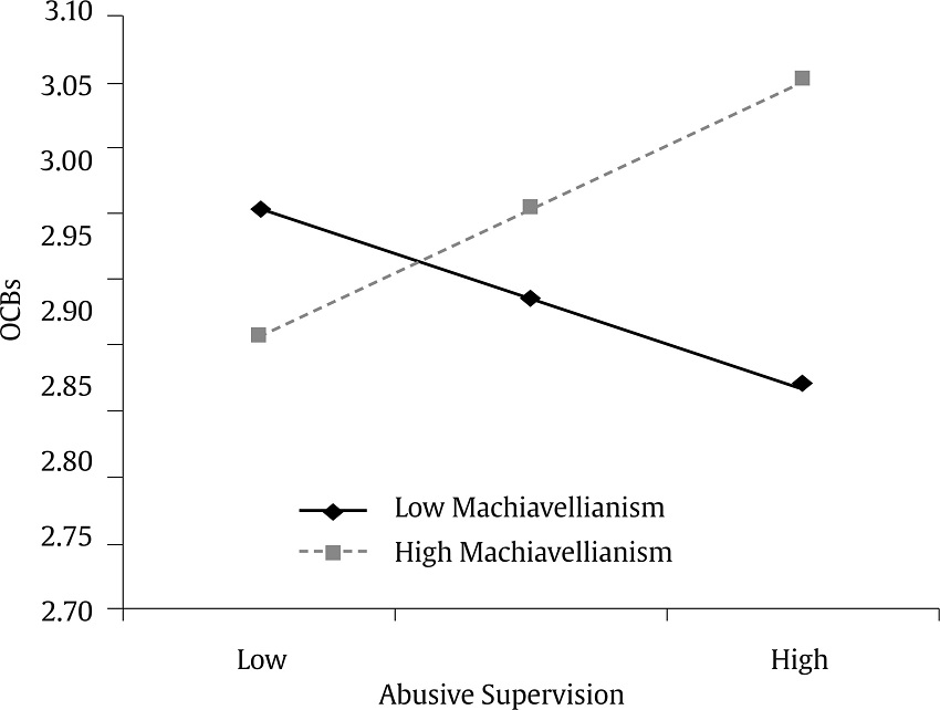 Hypothesis 4c: Machiavellianism moderates the relationships of mobbing and abusive supervision with OCBs in such a way that individuals who score high on Machiavellianism report lower levels of OCBs when they are exposed to high levels of mobbing and abusive supervision than those who score low on Machiavellianism.