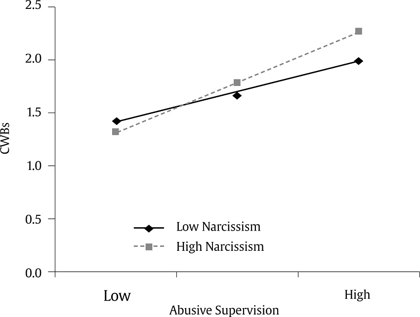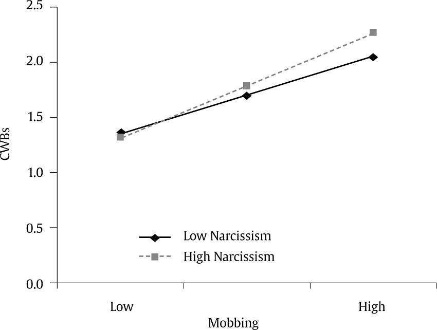 Hypothesis 5a: Narcissism moderates the relationships of mobbing and abusive supervision with CWBs in such a way that individuals who score high on narcissism report higher levels of CWBs when they are exposed to high levels of mobbing and abusive supervision than those who score low on narcissism.