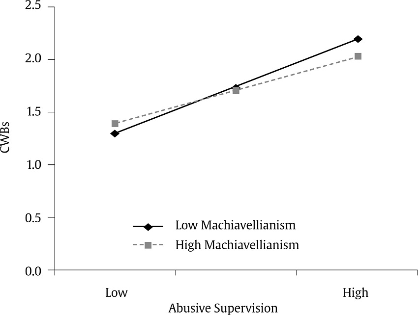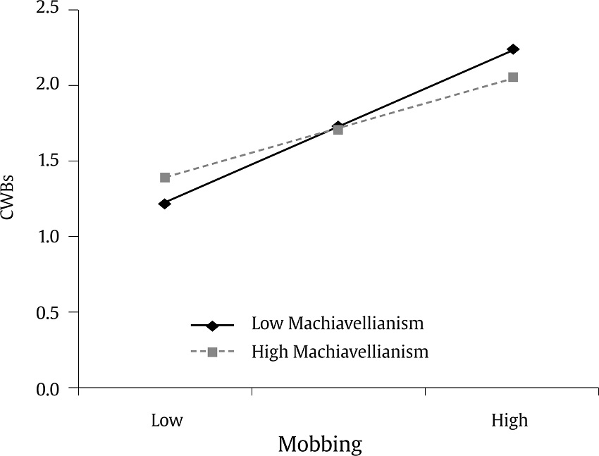 Hypothesis 5c: Machiavellianism moderates the relationships of mobbing and abusive supervision with CWBs in such a way that individuals who score high on Machiavellianism report higher levels of CWBs when they are exposed to high levels of mobbing and abusive supervision than those who score low on Machiavellianism.