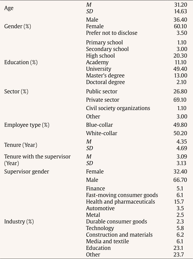 The online survey was prepared using Qualtrics software. The authors briefly described the topic of the study and shared the questionnaire link on online professional networks such as Linkedin, e-mail, and WhatsApp groups and via their social media accounts such as Twitter and Instagram. In addition, personal communication was established with colleagues and Human Resources specialists in different organizations. The online gift cards worth 25 TL were sent to participants who correctly responded to the bogus items, filled out the complete survey package, and gave an e-mail address. The participants’ demographic characteristics are presented in Table 1.