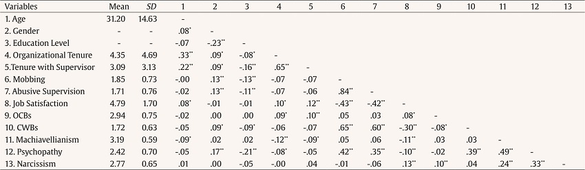 The job satisfaction scale had a relatively high mean value, whereas abusive supervision, mobbing, and CWB scales had relatively low means (see Table 2). The means of the remaining scales were close to the midpoint. Mobbing was positively correlated with abusive supervision, CWBs, and psychopathy. Further, mobbing was negatively correlated with job satisfaction. Abusive supervision was also positively correlated with CWBs and psychopathy but negatively correlated with job satisfaction. Job satisfaction was positively correlated with narcissism. Also, job satisfaction was negatively associated with CWBs, Machiavellianism, and psychopathy. OCBs were positively correlated with narcissism. Also, OCBs were negatively related to CWBs. CWBs were positively correlated with psychopathy. Machiavellianism was positively associated with psychopathy and narcissism. Psychopathy was positively correlated with narcissism.