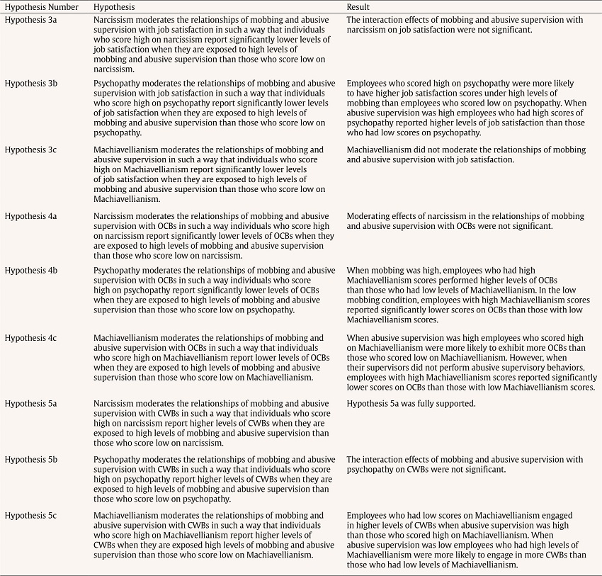 One of the main contributions of the study is providing support for the existing body of research by evaluating the links of different types of workplace mistreatment with important outcomes using a comprehensive model. Another main contribution of the study is shedding light on the moderating effects of the DT personality traits on the relationships of mobbing and abusive supervision with positive (i.e., job satisfaction, and OCBs) and negative (i.e., CWBs) workplace outcomes.
