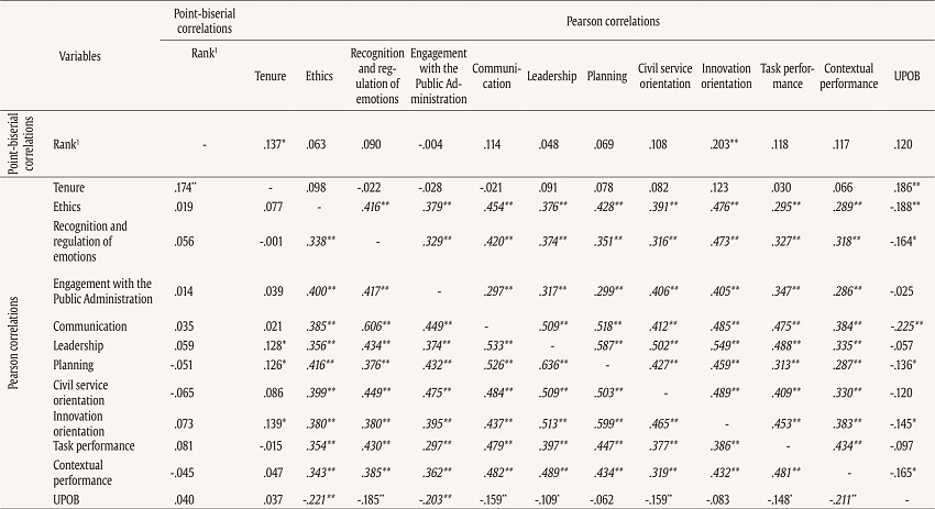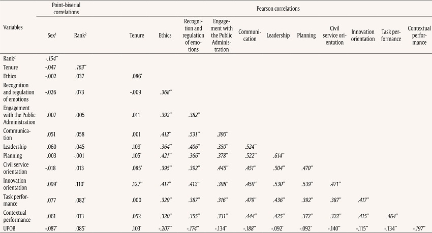We posit that it would be useful for future research to complement our analysis with in-depth research on the professional career of public managers, measuring UPOB and other pro-social and extra-role behaviours with objective data (e.g., complaints and satisfaction of the public and subordinates), and taking into account the relevant process for promotion to those positions (e.g., merit-based assessment, direct appointment). In addition, and based on the correlations found between UPOB and managerial skills, it would be interesting to investigate in future studies the possibility that both poorer communication skills and poorer control of emotions promote UPOB, perhaps due to difficulties in expressing oneself and act when faced with an ethical problem. Finally, given that highly selective HR procedures are especially sensitive to range restriction in the sample (e.g., Hunter et al. 2006), we suggest that future studies adjust for range restriction, especially when performed by practitioners beyond research purposes.