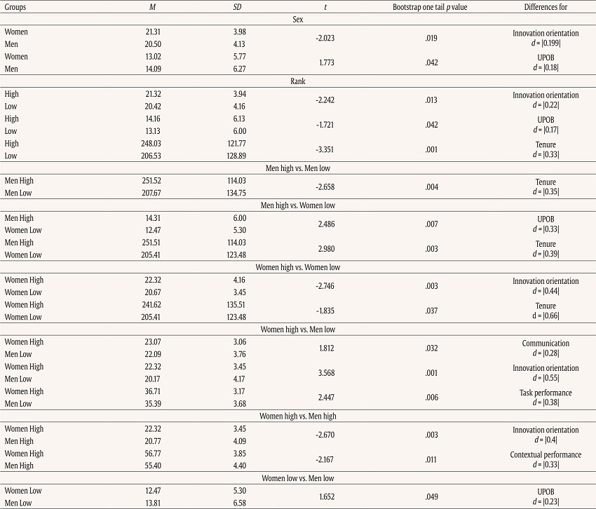 Finally, regarding counterproductive performance, Table 3 shows a significant association between Sex and UPOB (r = -.087, p < .05). These results are consolidated when analyzing the mean differences in Table 4, with men scoring higher in UPOB than women (t = 1.773, p = .040). It was also observed that Rank correlated positively with UPOB (r = .085, p < .05), and when taking sex into account, it was found that men in higher responsibility levels scored higher in UPOB than women in lower responsibility levels (t = 2.486, p = .007), and that men in low responsibility levels scored higher in UPOB than women at those same levels (t = 1.652, p = .049). It should also be noted that, in the case of women (Table 5), Tenure correlated significantly and positively with UPOB (r = .186, p < .01). This implies that both H7a andH7b are supported, since high-level managers scored higher in UPOB than low-level managers, and men did indeed score higher than women in UPOB.