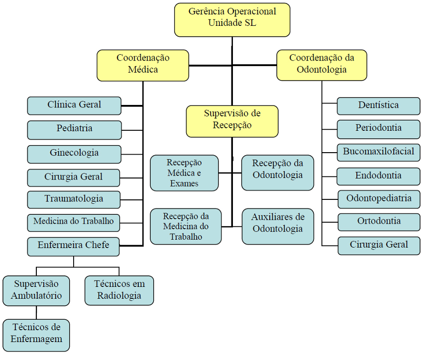 A unidade apresenta como cargo mais elevado na estrutura organizacional a gerência operacional, responsável por todas as decisões de caráter operacional da clínica.