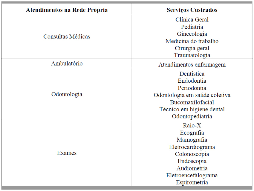 c) os serviços foram segmentados em consultas médicas, ambulatório, odontologia e exames, sendo custeado cada um dos atendimentos dentro dos grupos. A exceção é quanto ao ambulatório, que por abranger uma grande variedade de serviços foi considerado em seu conjunto;