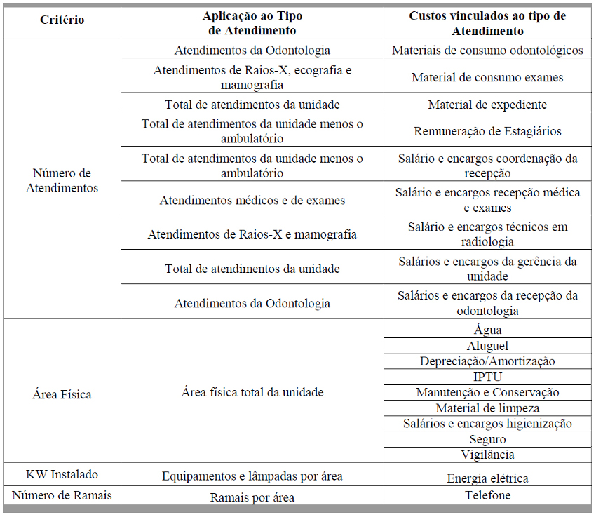 Para a mensuração de custos foram definidos alguns critérios. São eles: