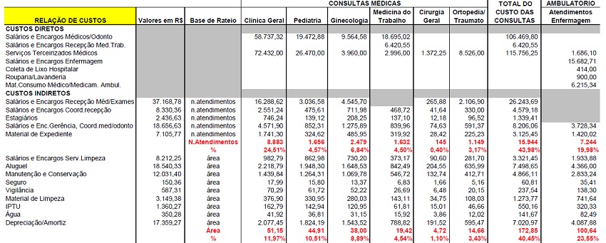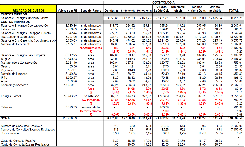 Os custos, depois de apropriados aos atendimentos, apresentam o valor total por tipo de atendimento. Utiliza-se o total deste custo para apurar o custo unitário de cada atendimento, dividindo o montante pelo total de atendimentos realizados.