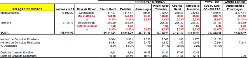 A seguir são apresentadas as tabelas com os resultados dos cálculos dos custos envolvidos. As tabelas estão divididas por consultas médicas, atendimentos em ambulatório, odontologia e exames.