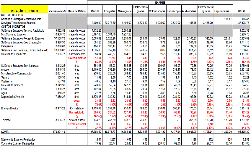 f) O eletrocardiograma, que é um exame cardiológico, apresentou um custo unitário de R$ 9,36, com a realização de 483 exames no período.