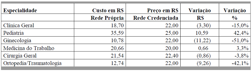 Na Tabela 4, é apresentado o comparativo do valor das consultas médicas na rede credenciada com o custo apurado na rede própria. Observa-se que para efeito desse comparativo utilizou-se, como custo da Rede Própria, os valores das consultas efetivamente realizadas e não das consultas possíveis. Como o uso efetivo está abaixo da capacidade, esse custo está acima do que seria caso não houvesse ociosidade. Assim, tem- se aqui um procedimento conservador na avaliação comparativa com o custo da Rede Credenciada.