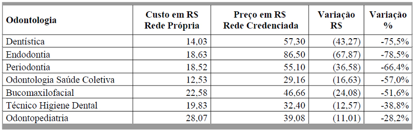 O comparativo de valores da odontologia com a rede credenciada é apresentado na Tabela 5: