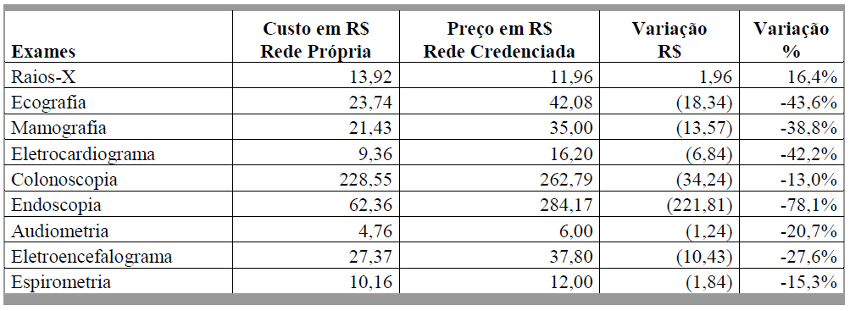 Também foi elaborado comparativo do custo dos exames na rede credenciada, conforme apresentado na Tabela 6.