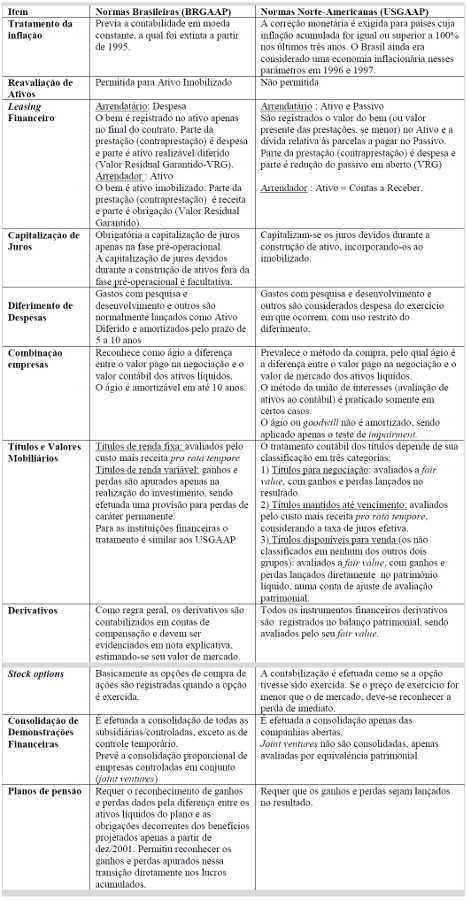 Nesse enfoque, o processo em curso no Brasil, após a Nova Lei das S/As pode ser caracterizado como harmonização e não padronização internacional. Como exemplos de algumas diferenciações, podem ser citadas a proibição pela Nova Lei das S/As da reavaliação de ativos, a qual é permitida pelos IFRS, bem como a obrigatoriedade da Demonstração do Valor Adicionado, prescrita pela mesma lei brasileira, mas não pelos IFRS. Uma comparação sintética das principais diferenças entre as normas contábeis brasileira e os US GAAP é apresentada na Tabela 1.