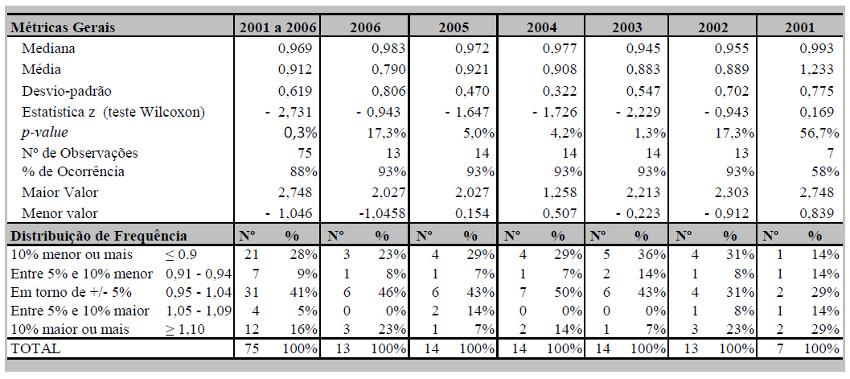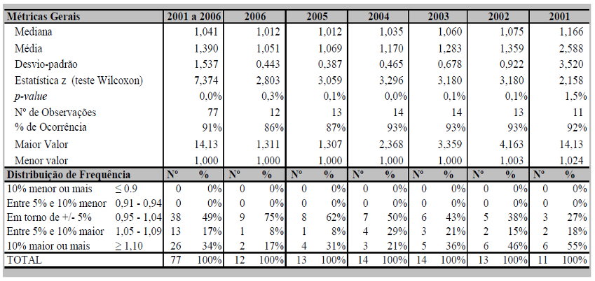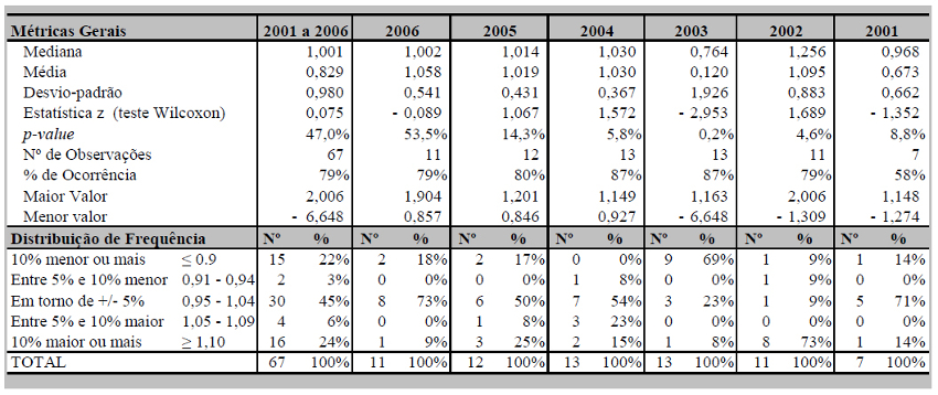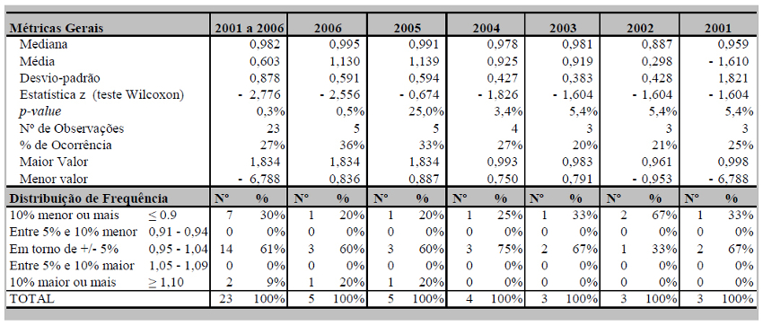 Para aprofundar o exame dessa inconsistência na série temporal estudada, buscou- se examinar o comportamento dos ICs mediante agrupamentoes dos anos em dois subperíodos, 2001-2002 e 2003-2006, conforme o Painel C. O teste de Wilcoxon indica que não há um comportamento consistente para todo o período estudado (p-value = 38,7%). Por outro lado, ficou confirmada a assimetria entre os dois subperíodos (p-values = 0,1% e 0,3%), com a mediana do IC de 1,18 no primeiro subperíodo e de 0,91 no segundo, ambos estatisticamente significativos a 1%.