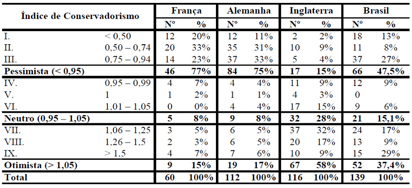Assim, um Índice de Conservadorismo maior que 1 implicaria que o lucro apurado conforme as normas do país é maior (otimismo) que o lucro calculado segundo os US GAAP. Já um índice menor que 1 implicaria que o lucro apurado conforme as normas do país é menor (conservadorismo) do que o apurado conforme os US GAAP.