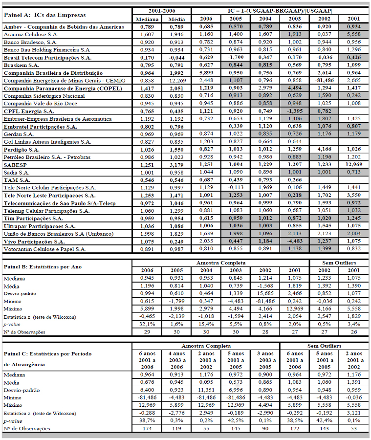 A Tabela 3 apresenta no Painel A os ICs anuais das 30 empresas brasileiras com ADRs na NYSE, bem como a média e mediana por empresa no período 2001-2006. As células em branco correspondem a valores não disponíveis. Os dados em negrito representam as 15 empresas que publicaram a Tabela de Reconciliação do Lucro no Formulário 20-F, cujos ICPs são analisados posteriormente neste trabalho.