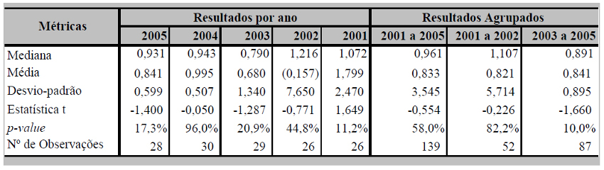 Para melhor comparação entre os resultados deste estudo e os do período estudado por Santos et al. (2007), apresentados na Tabela 4, a Tabela 3 inclui as colunas dos períodos 2003-2005 e 2001-2005. Pode ser verificado que em todos os anos estudados, bem como nos dois subperíodos, as médias se alteraram e o p-value diminuiu expressivamente. Assim, os resultados deste estudo esclarecem as inconsistências identificadas no estudo de Santos et al (2007), que havia encontrado resultados estatisticamente significativos a 10% apenas no subperíodo 2003-2005. Isso indica que a consideração das correções das demonstrações efetuadas pelas empresas nas publicações de exercícios posteriores, somada à utilização de teste não-paramétrico, representa uma contribuição metodológica da presente investigação.