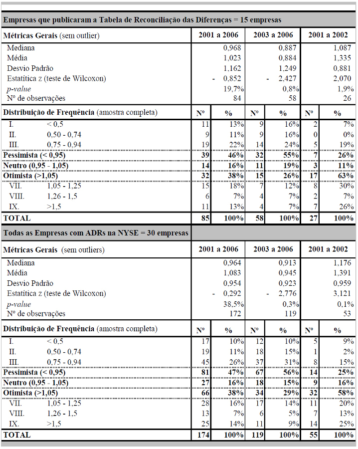 A Tabela 5 compara os indicadores gerais e a distribuição de freqüência das 30 empresas brasileiras emissoras de ADRs na NYSE com as 15 empresas que publicaram a Tabela de Reconciliação de Lucros no Formulário 20-F no período. A relativa simetria desses valores entre ambas as populações, quer para o período total 2001-2006 quer para os subperíodos 2003-2006 e 2001-2002, faz inferir que as 15 empresas analisadas no trabalho constituem amostra representativa do total das emissoras brasileiras de ADRs na NYSE no período e, que, portanto, os resultados relativos às 15 empresas estudadas poderiam ser extrapolados para a população das 30 emissoras de ADRs na NYSE.