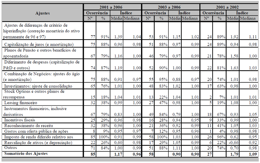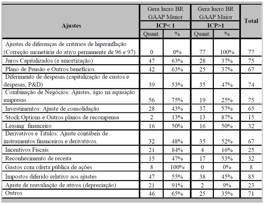 Dentre os itens que ocorrem com maior frequência no período total 2001-2006, além do Imposto de Renda (100%, com ICP de 0,90), estão Correção Monetária (91%, 1,39), Juros (88%, 0,96), Combinação de Negócios (88%, 0,91) e Diferimentos de Despesas (87/%, 1,19). Isso significa que, por exemplo, a Correção Monetária é apontada em 91% das empresas que publicaram a Tabela de Conciliação do Lucro dos BRGAAP para os USGAAP, e tornaria o lucro das empresas que o apontaram, em média 39% superior pelos BRGAAP em relação ao lucro apurado conforme os USGAAP.