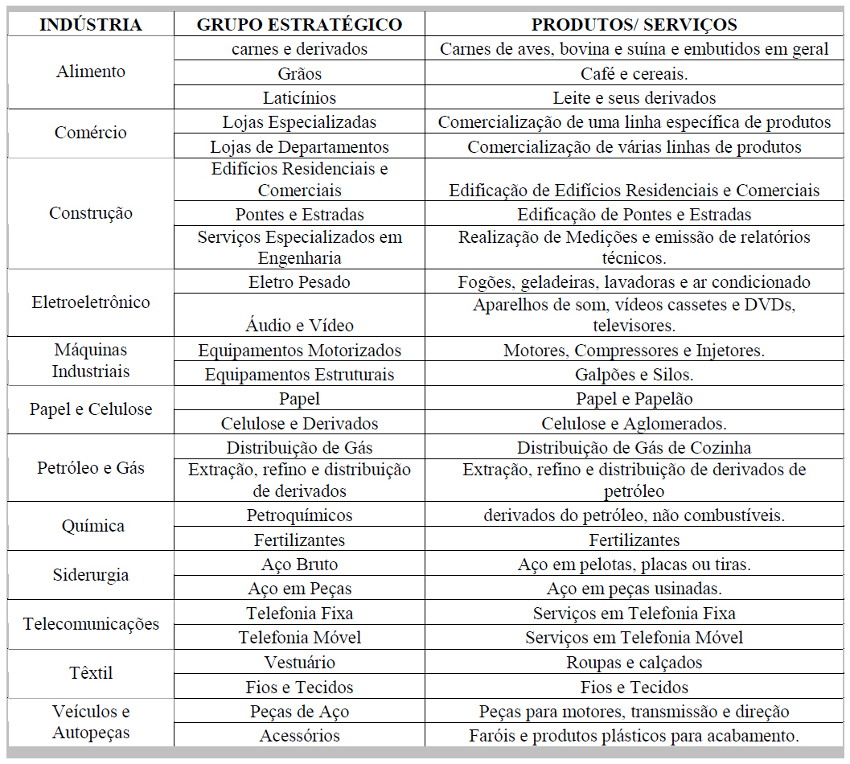 Utilizando os conceitos desenvolvidos no trabalho de Tang e Thomas (1992), aplicado às empresas brasileiras, Faria et al. (2005) oferecem um critério de separação de Grupos Estratégicos dentro das Indústrias: a similaridade de produtos e serviços oferecidos pelas empresas componentes. A tabela abaixo sumariza a forma utilizada para a separação dos Grupos Estratégicos: