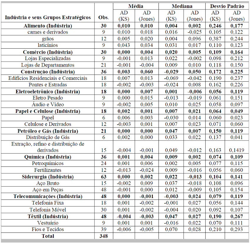 Os resultados obtidos com a análise descritiva da amostra evidenciam a relevância da dispersão dos valores das ADs, tanto nos resultados obtidos pelo modelo KS (1995), quanto pelos resultados apresentados no modelo de Jones modificado DSS (1995), confirmando assim a possibilidade da utilização do critério de formação de Grupos Estratégicos sugerido por Faria et al. (2005).
