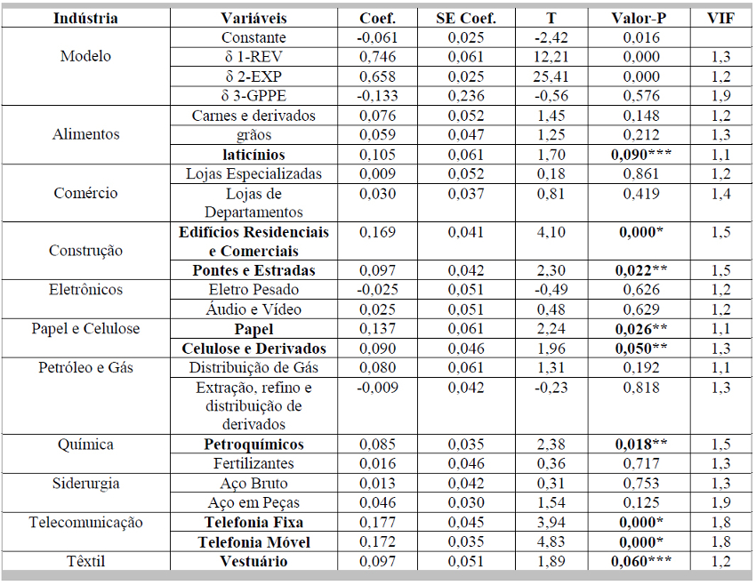 A ausência de multicolinearidade entre as variáveis pode ser verificada pela análise dos VIFs (variance inflaction factors) que se apresentaram abaixo de 5. Por meio das estatísticas t e seus p-values, verifica-se que os grupos “laticínios” do setor alimentício, “lojas especializadas” do setor de comércio, “edifícios residenciais e comerciais” e “pontes e estradas”, ambos do setor de construção e “telefonia fixa” do setor de telecomunicações, trazem poder explicativo ao Modelo Jones Modificado DSS (1995).